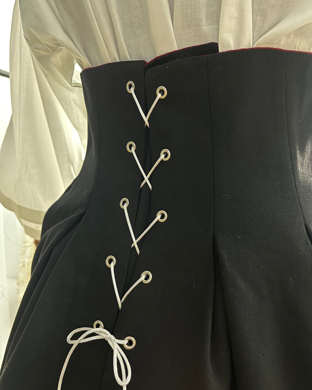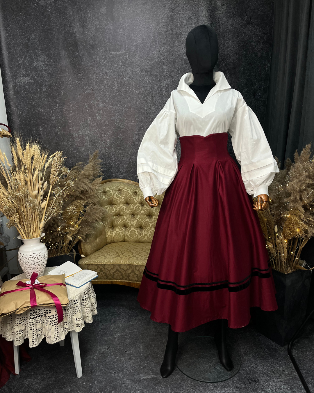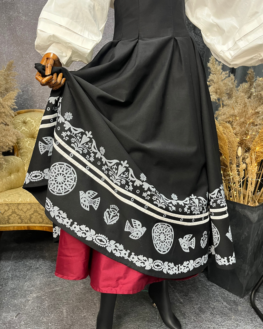 Двостороння спідниця з високим корсетним поясом з вибійкою, чорна/бордо (Індивідуальне пошиття)
