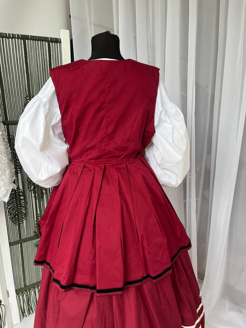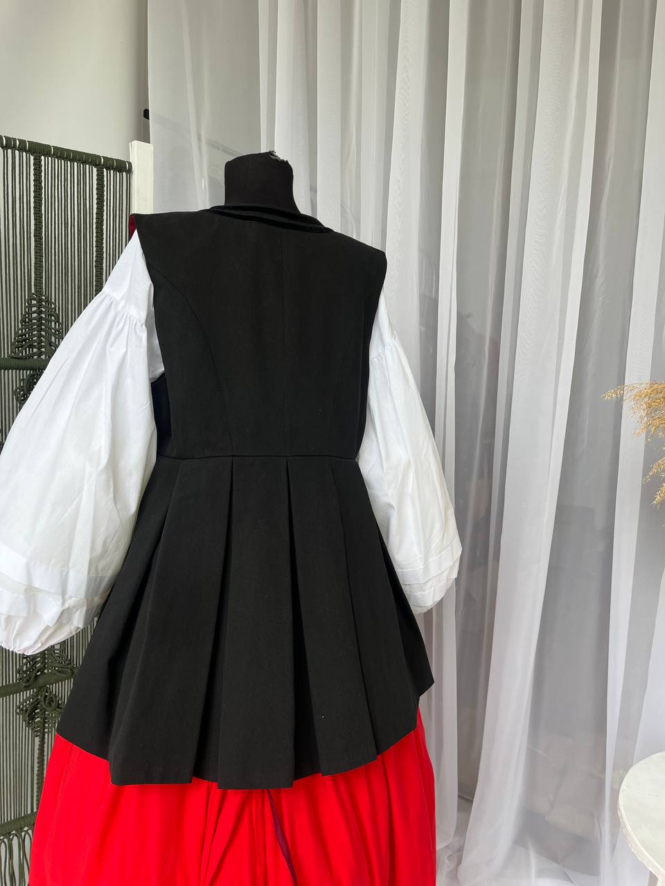 Зверху чітко сидить по фігурі, приталена, защіпається з лівого боку, а від стану розширюється, ззаду маючи зазвичай 5 пишних складок, які ще називають "вусами".