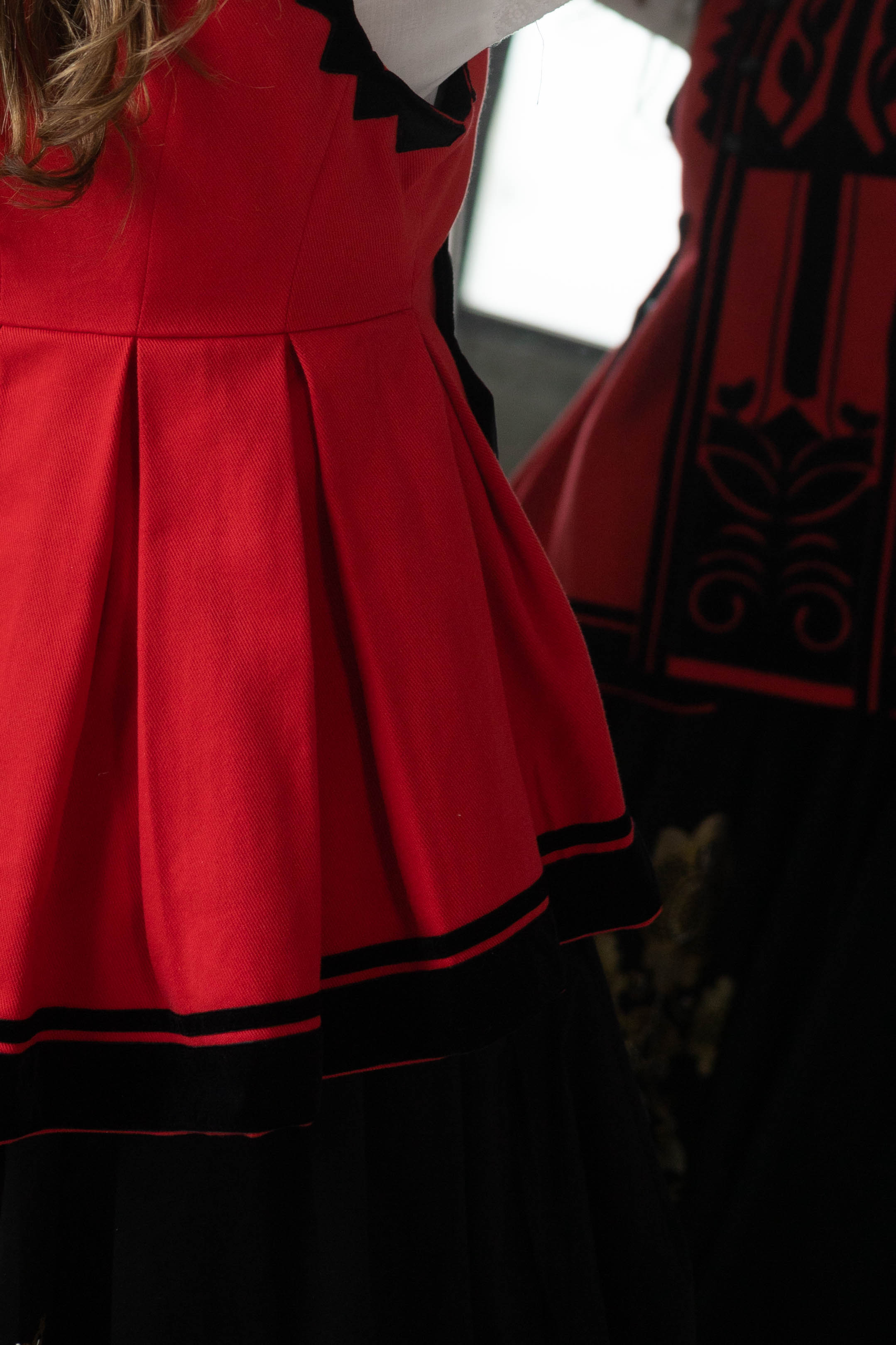 Зверху чітко сидить по фігурі, приталена, защіпається з лівого боку, а від стану розширюється, ззаду маючи зазвичай 5 пишних складок, які ще називають "вусами".