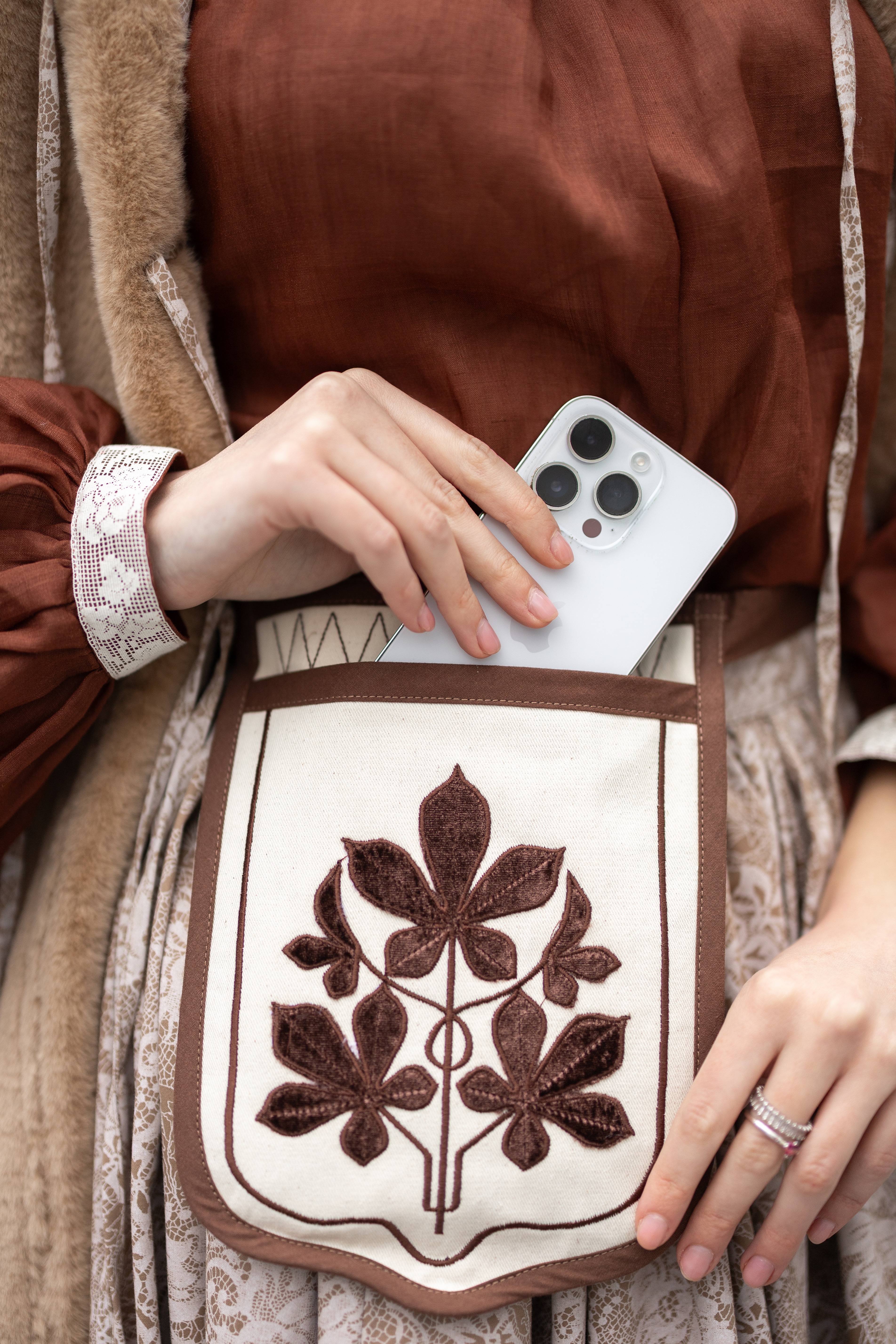 Ця ладунка виконана в особливій техніці: каштани вишиваються окремо оксамитом на цупкій тканині саржі, а далі, наче аплікація, кріпляться до самої кишеньки.
