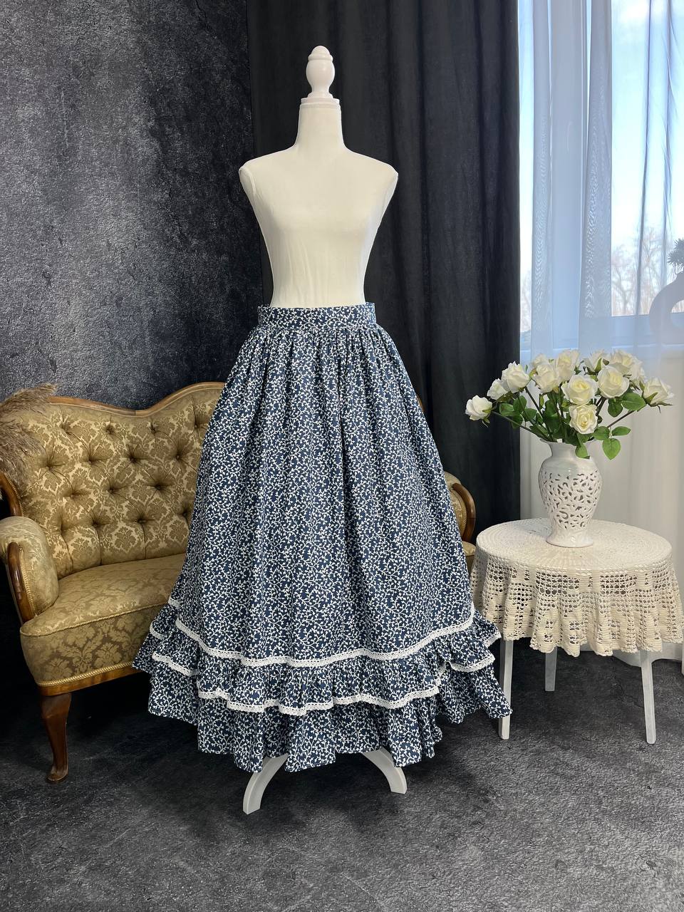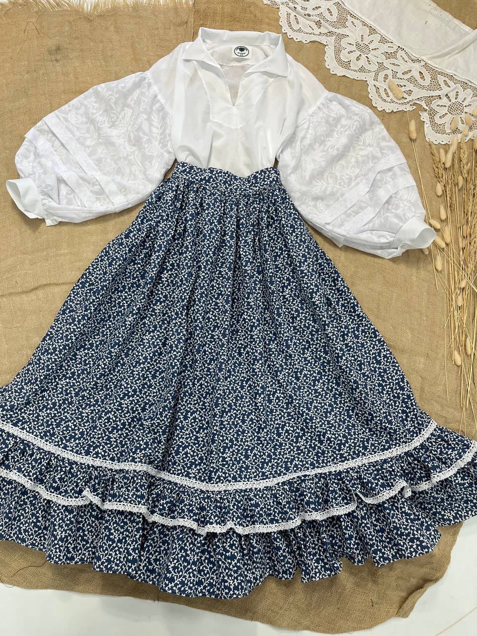 Одностороння спідниця з рюшами, прикрашена лляним мереживом.