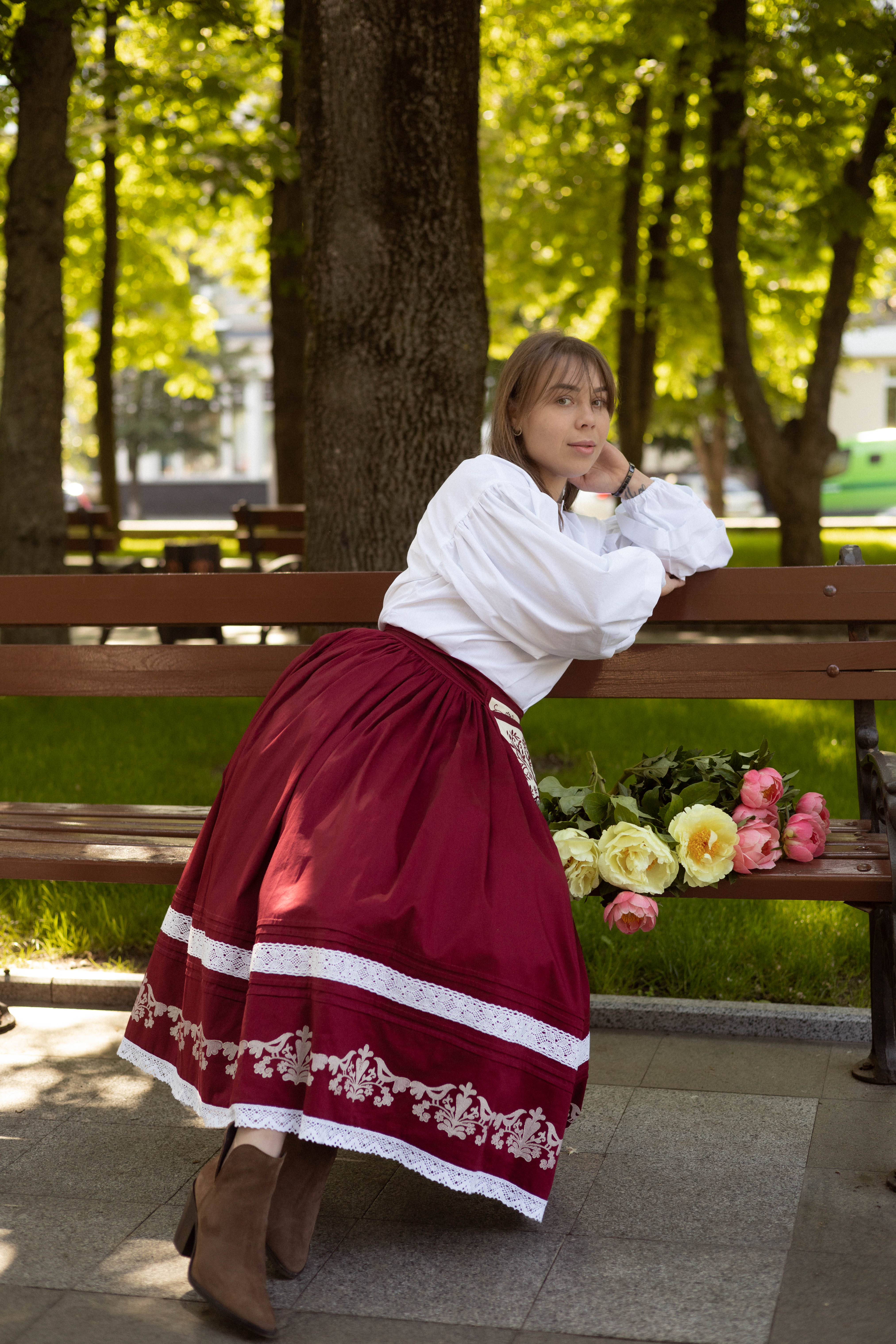 Спідничка оздоблена мереживом та защипами. Вибійка виконана фарбою, яка повністю проникає у волокна тканини - можна прати.