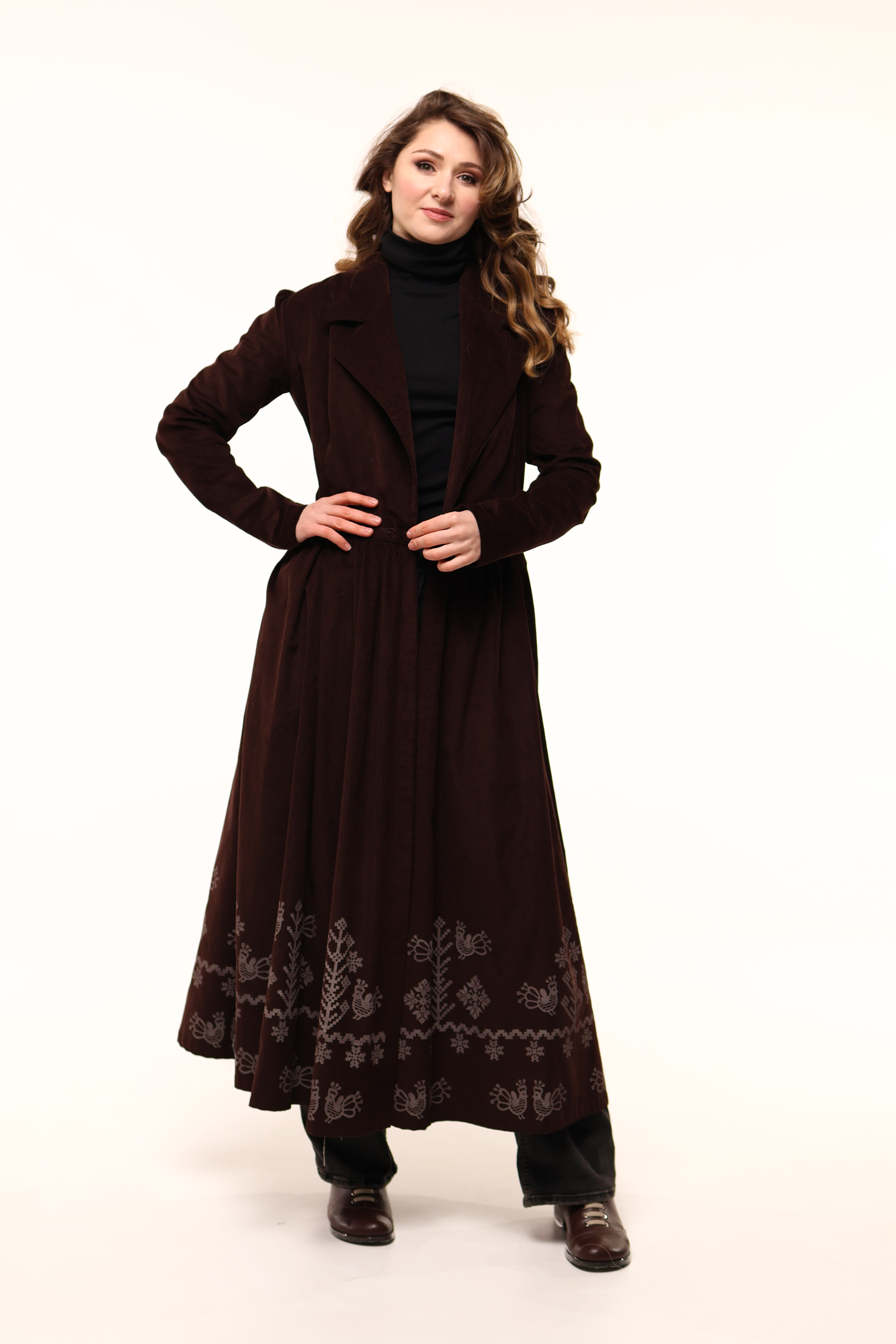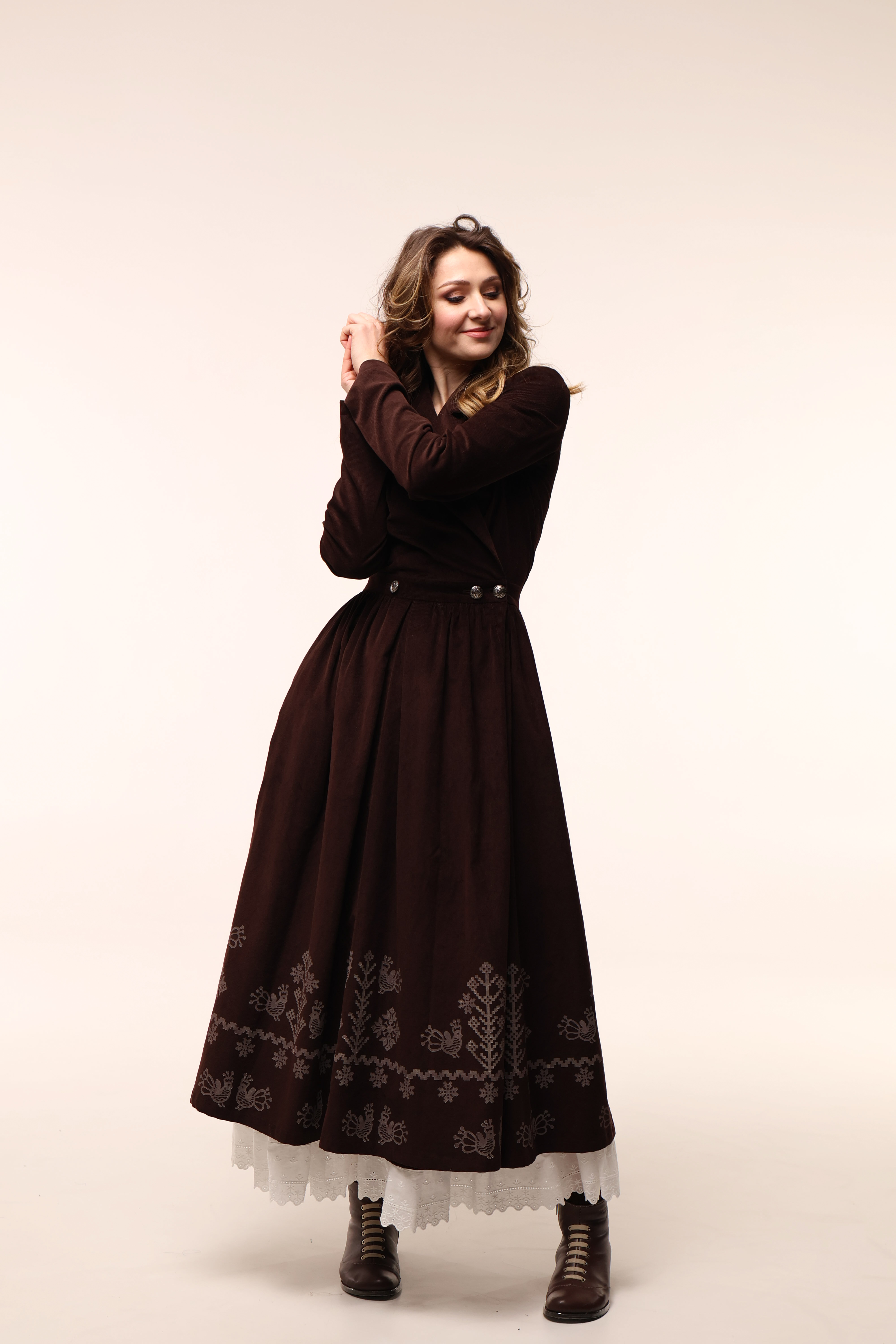 Сукня має бокові кишені та прикрашена вибійкою.