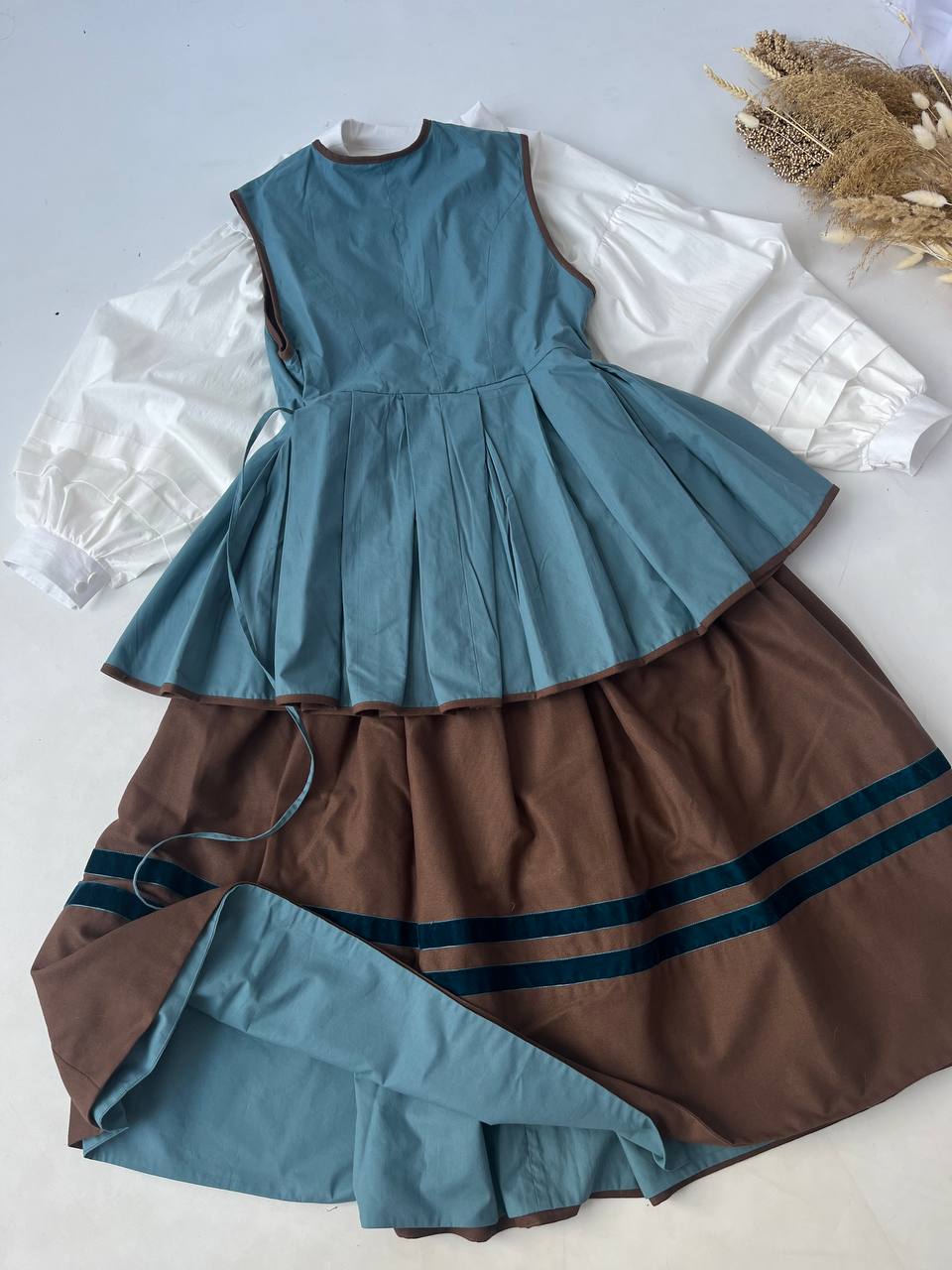 Зверху чітко сидить по фігурі, приталена, защіпається з лівого боку, а від стану розширюється, ззаду маючи зазвичай 5 пишних складок, які ще називають "вусами".