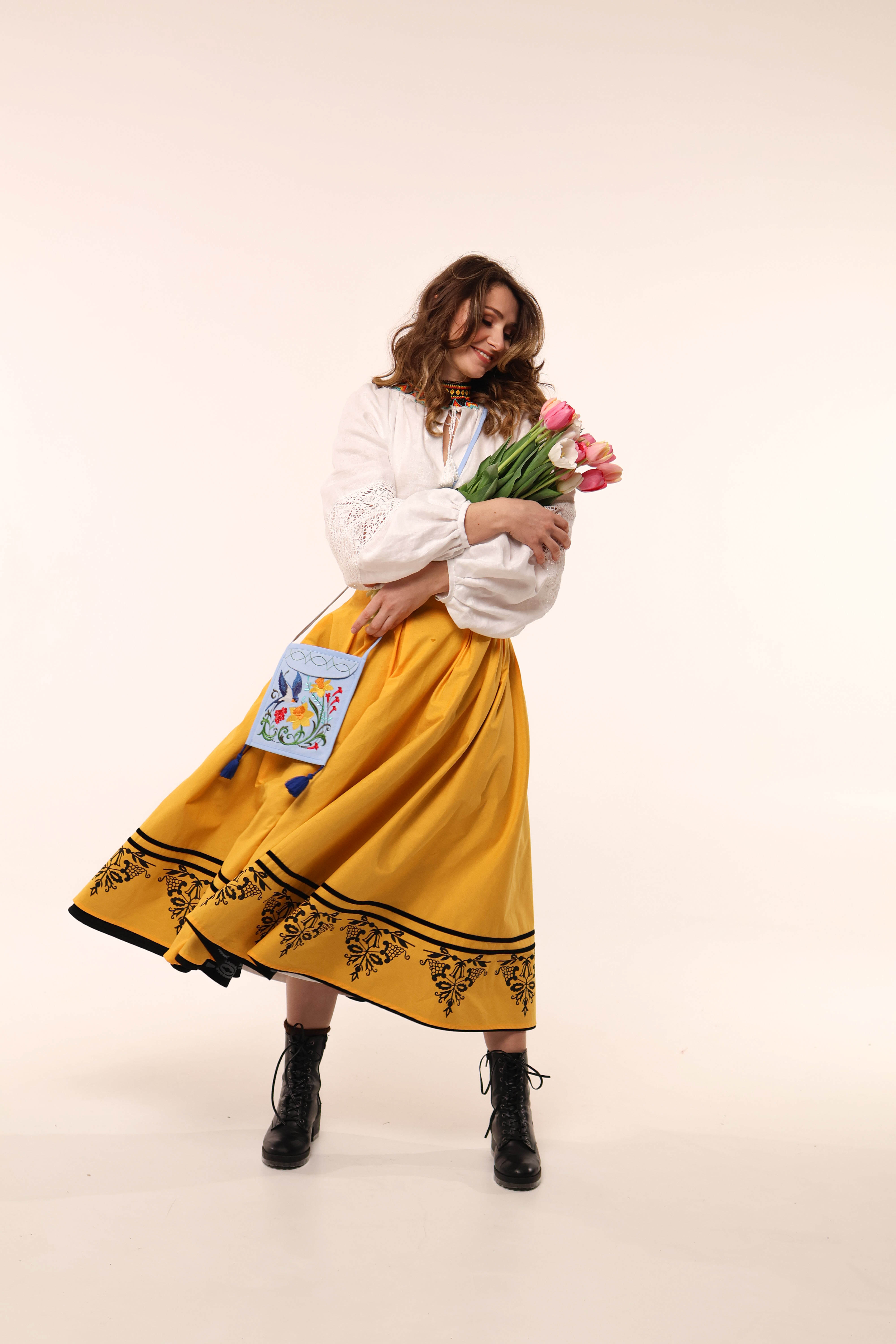 Двостороння спідниця з високим корсетним поясом з вибійкою, чорна/жовта