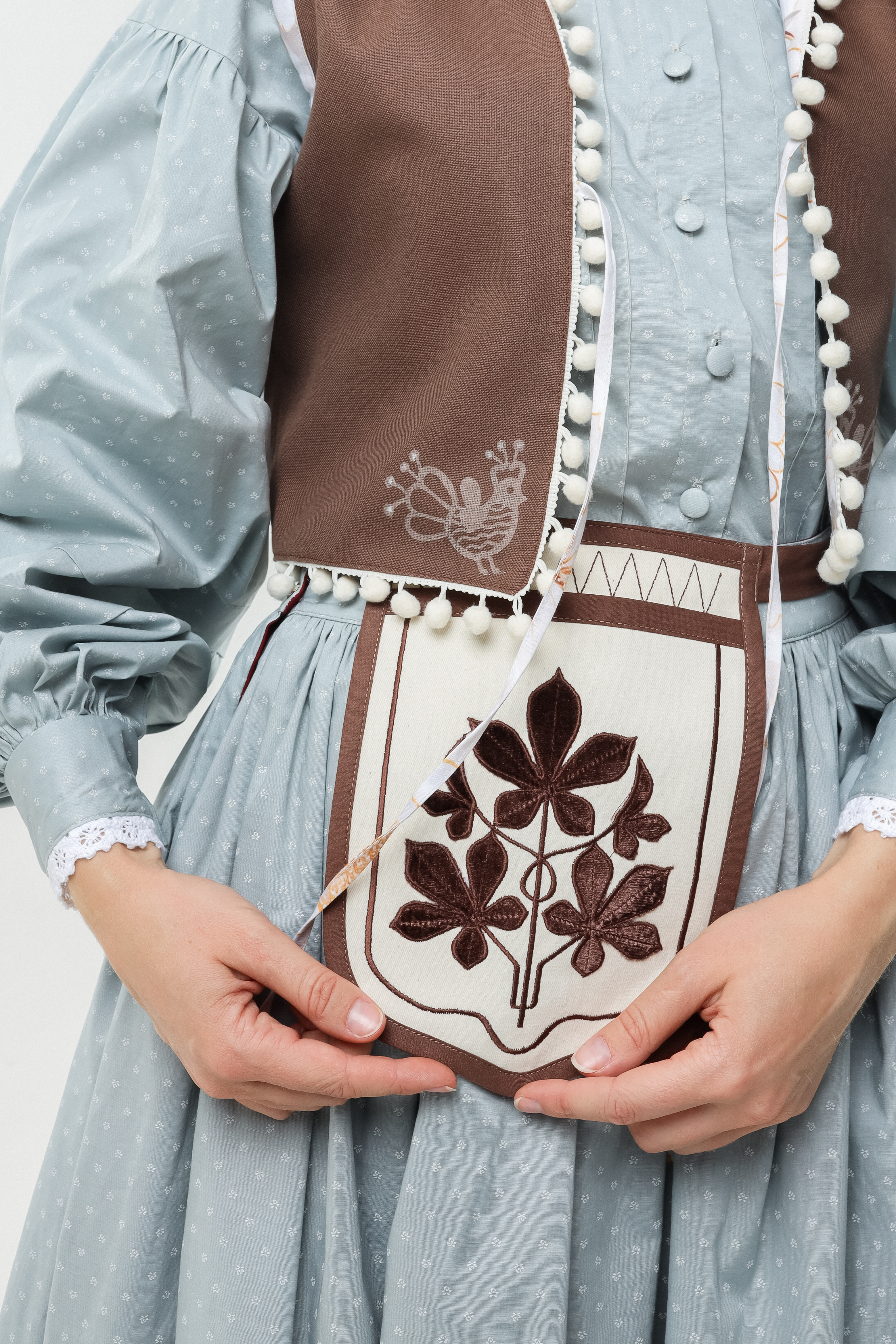 Ця ладунка виконана в особливій техніці: каштани вишиваються окремо оксамитом на цупкій тканині саржі, а далі, наче аплікація, кріпляться до самої кишеньки.