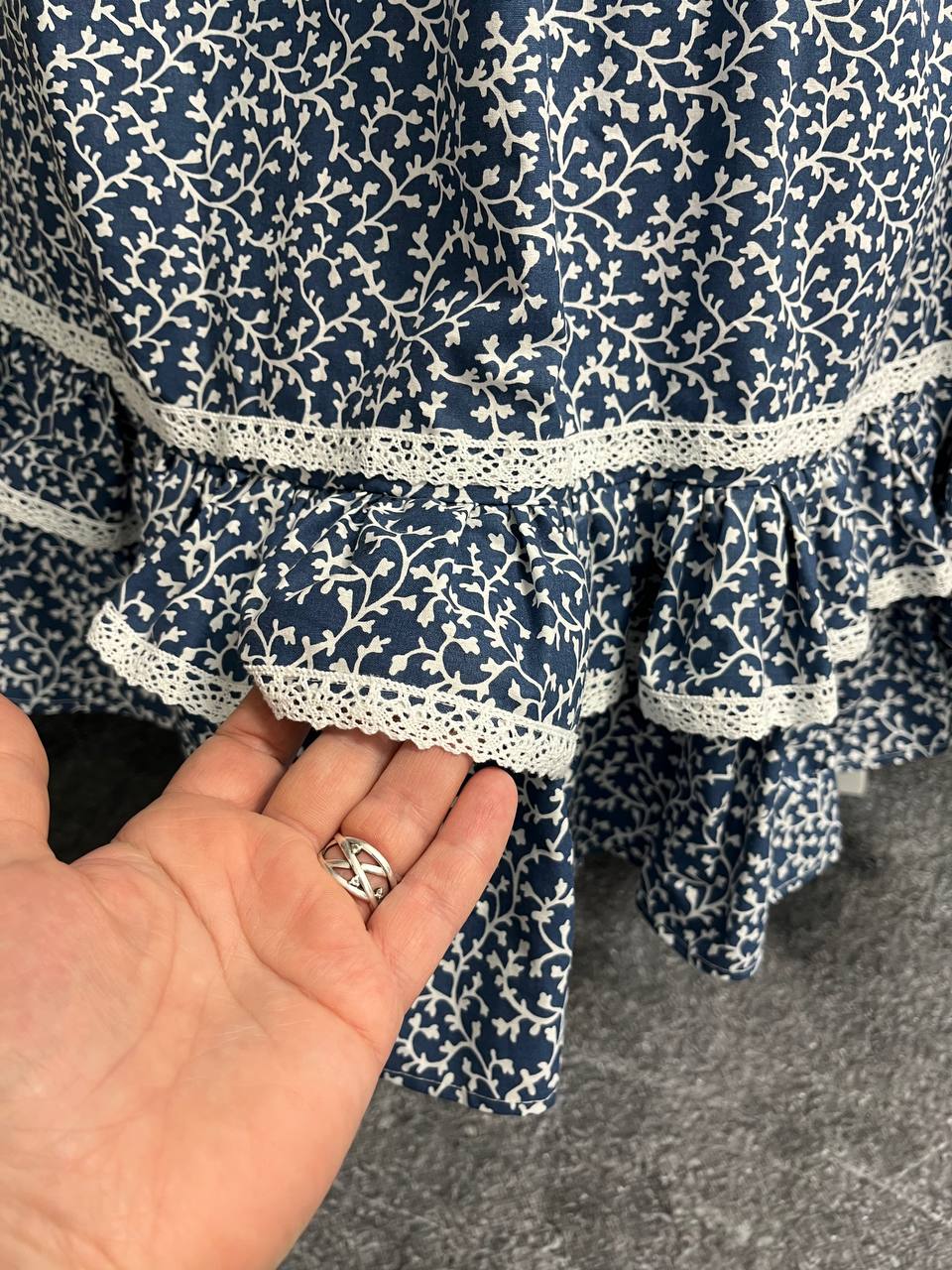 Одностороння спідниця з рюшами, прикрашена лляним мереживом.
