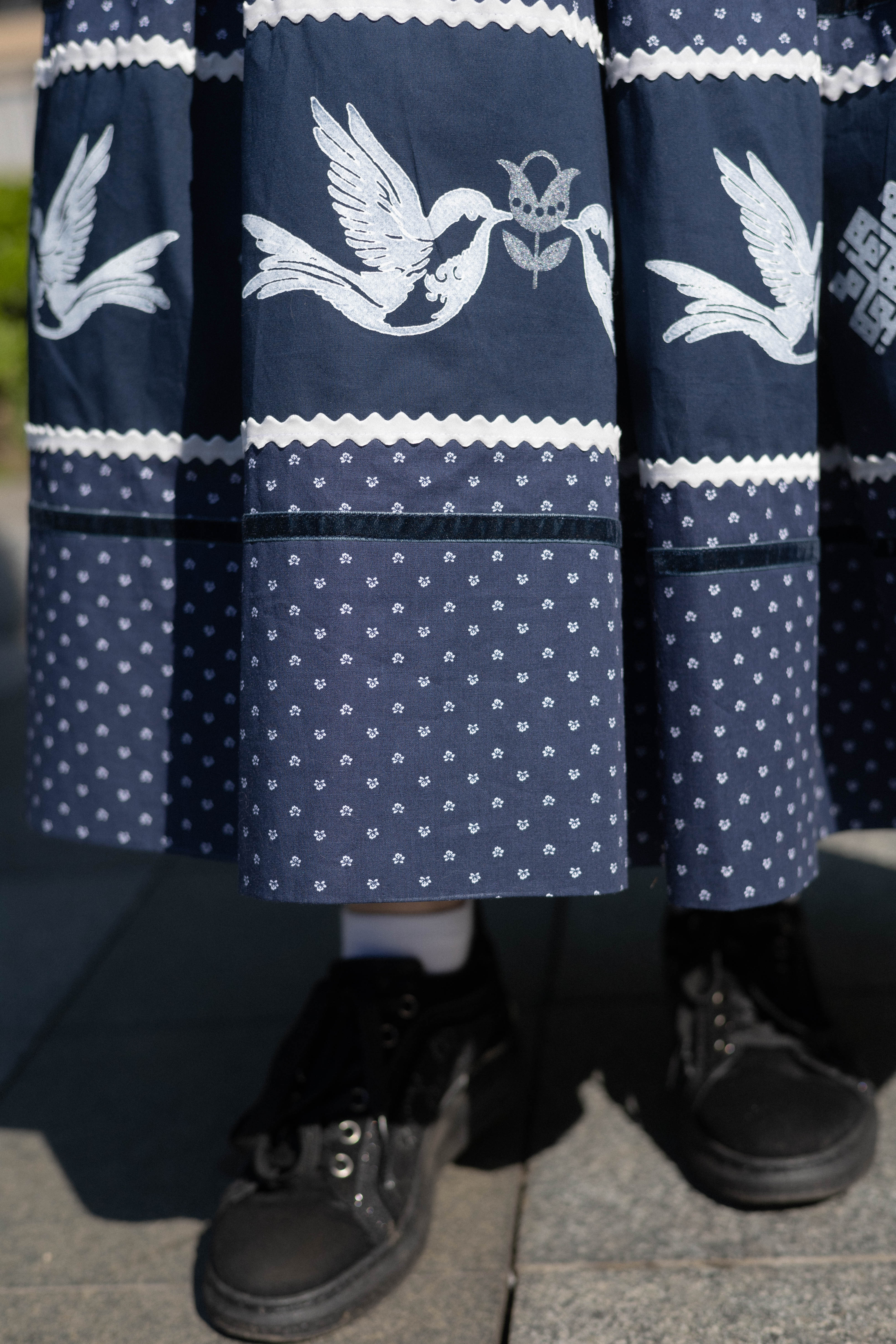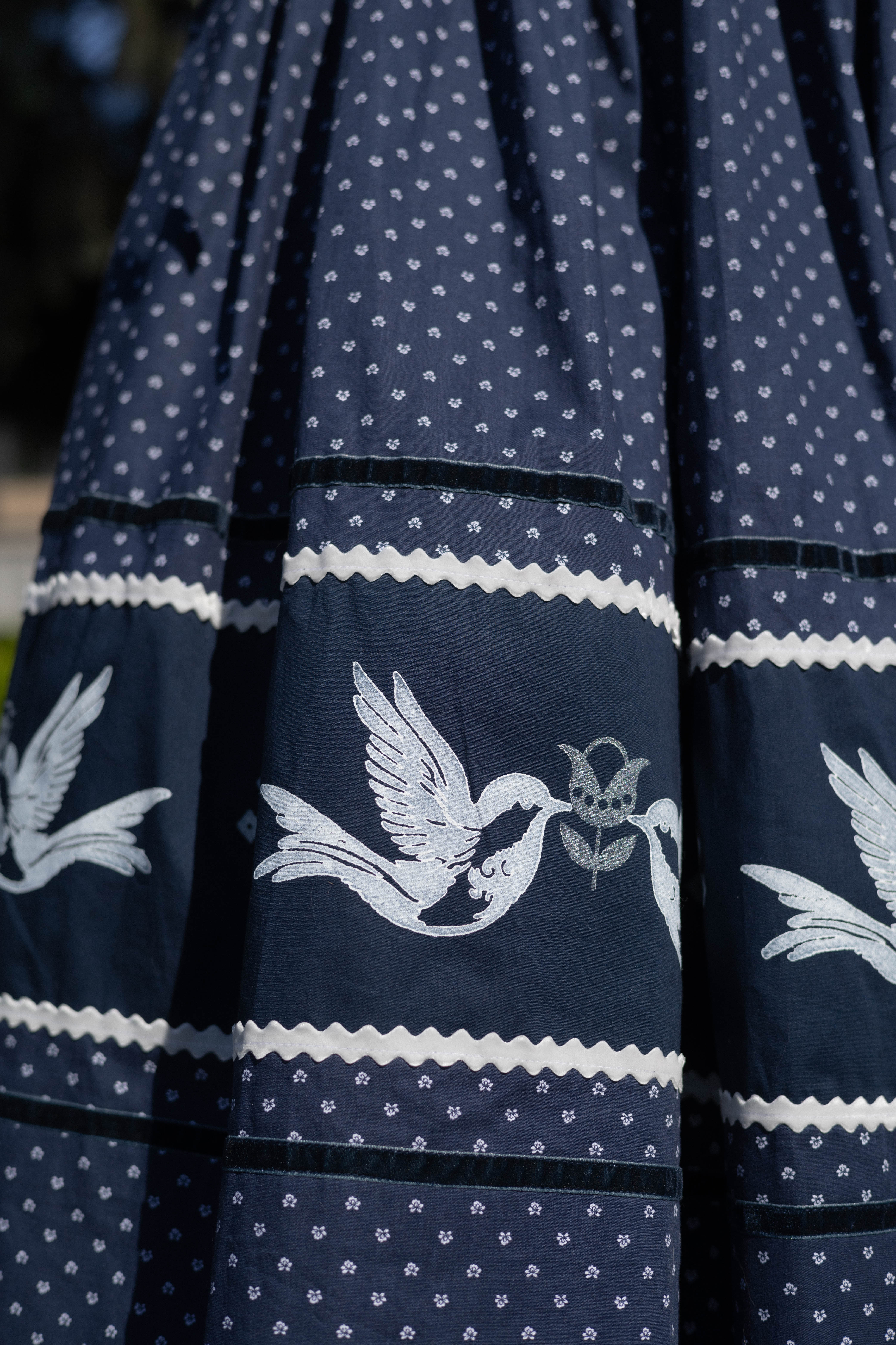 Спідничка оздоблена мереживом та защипами. Вибійка виконана фарбою, яка повністю проникає у волокна тканини - можна прати.