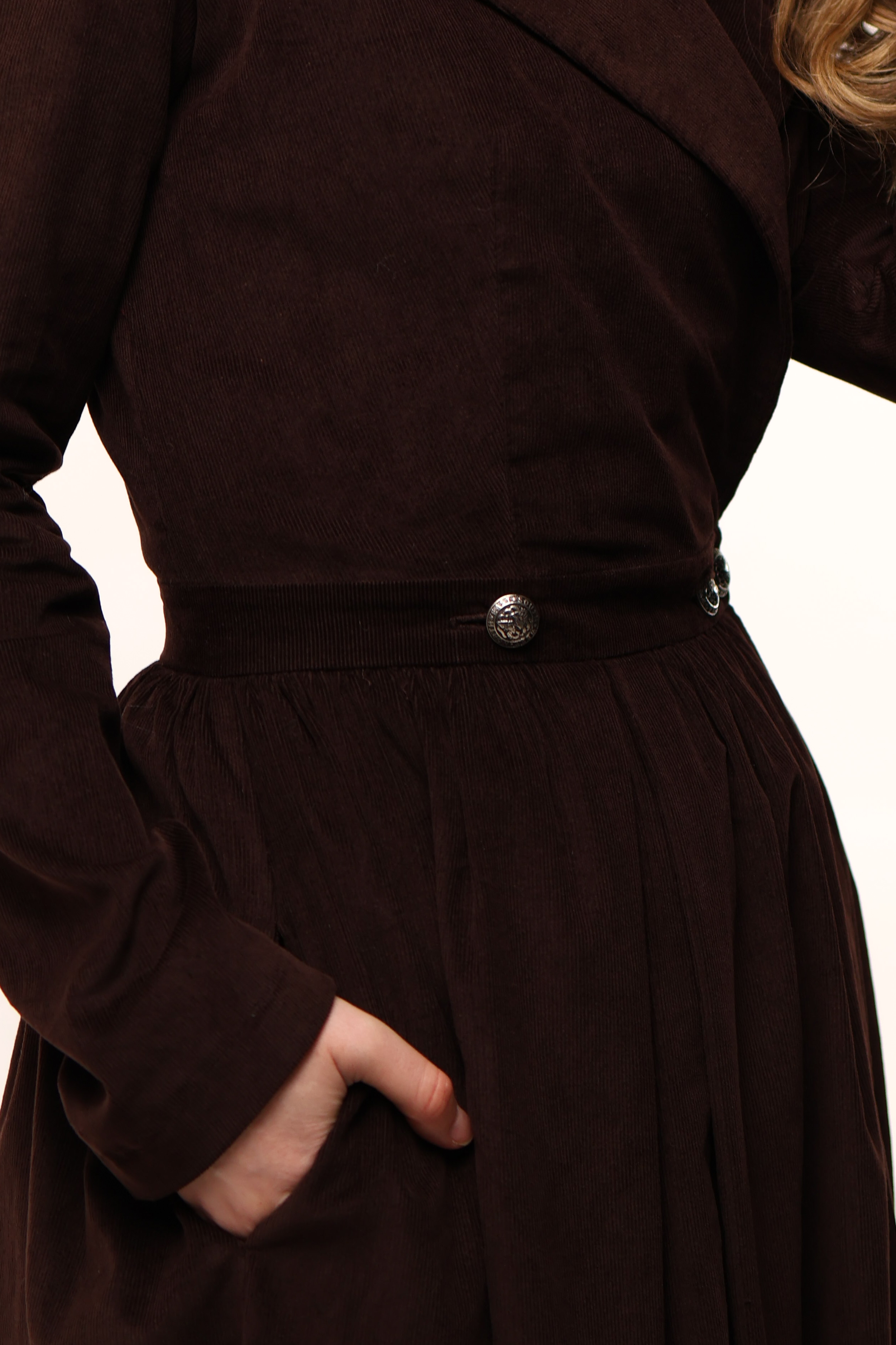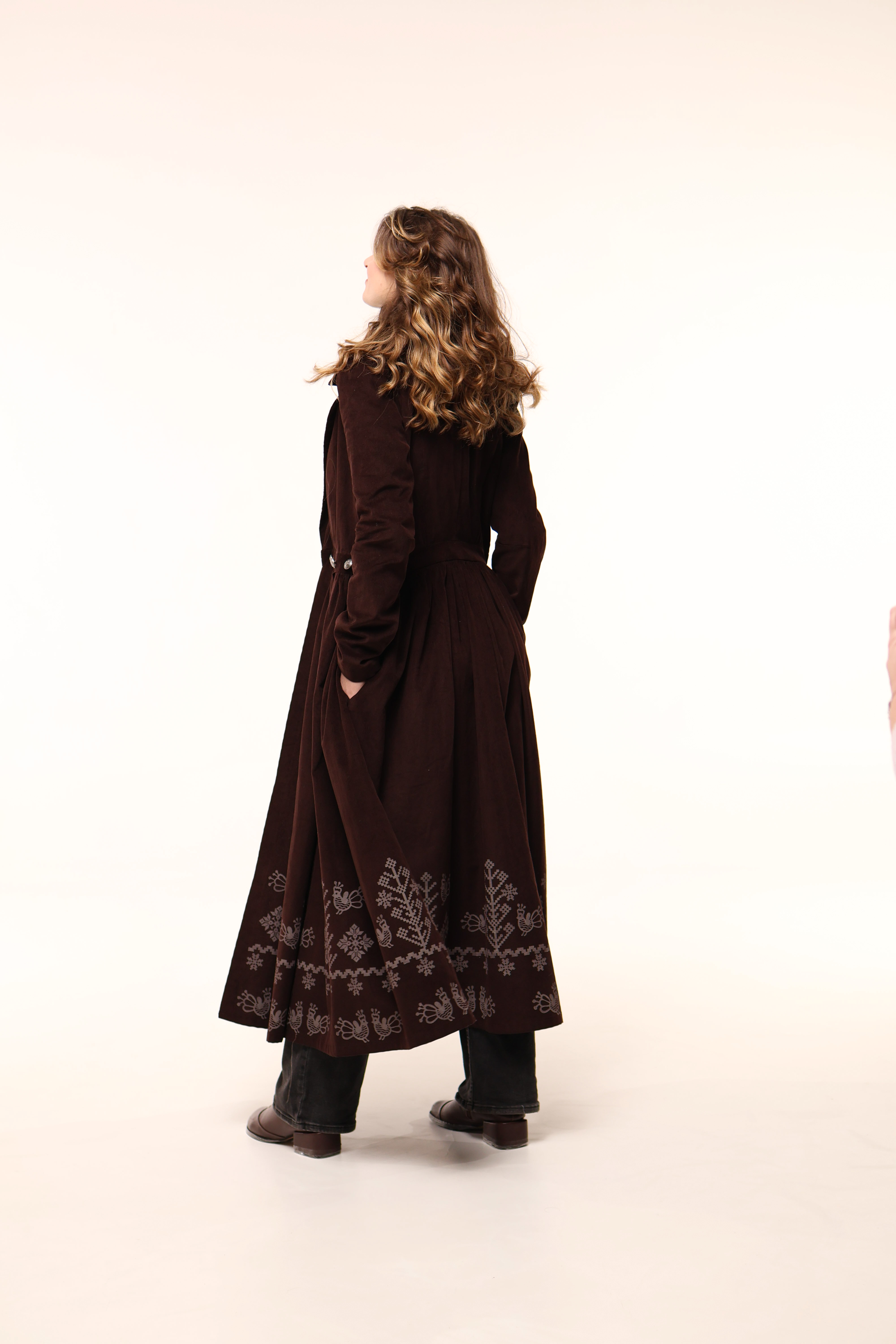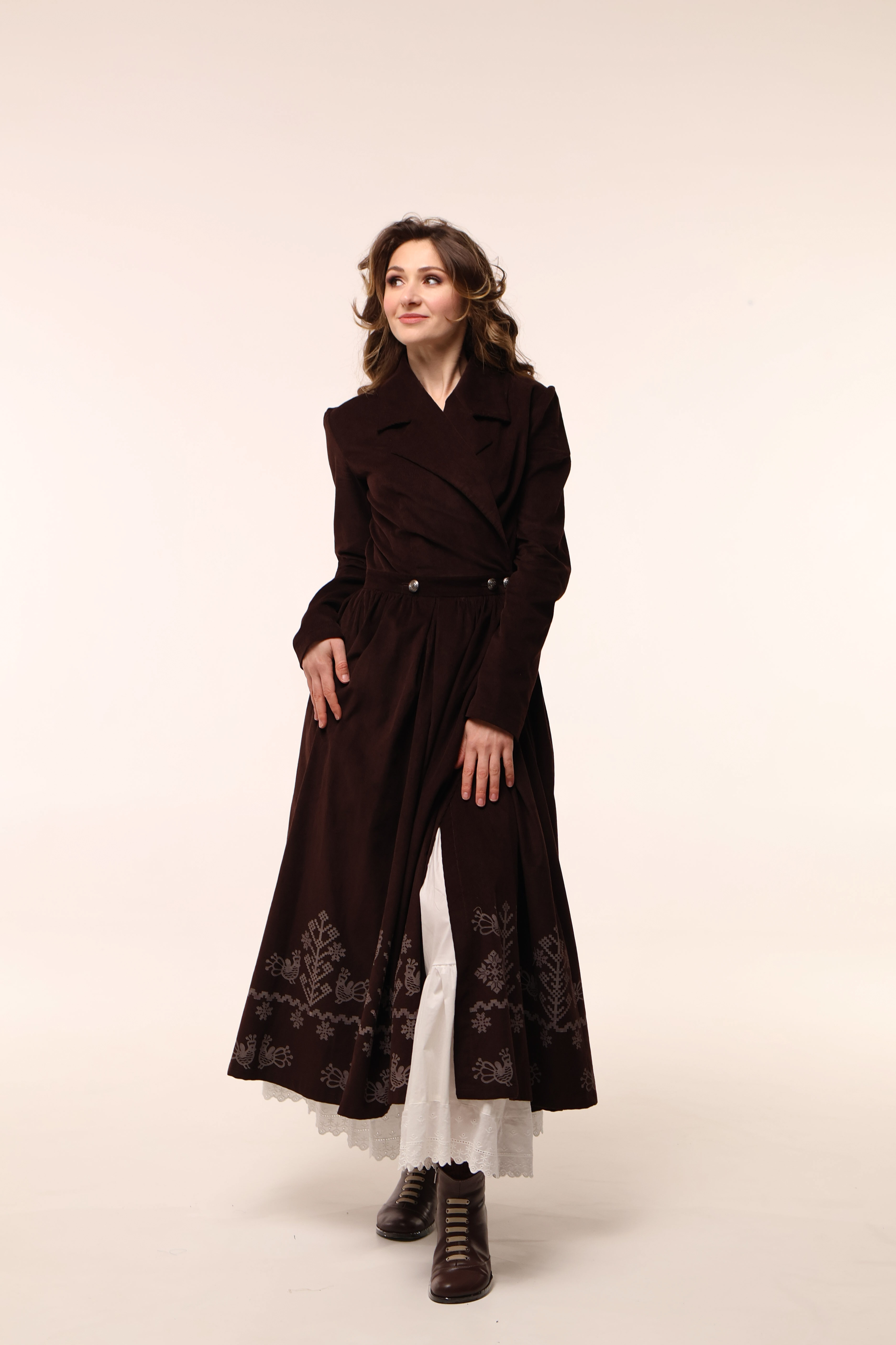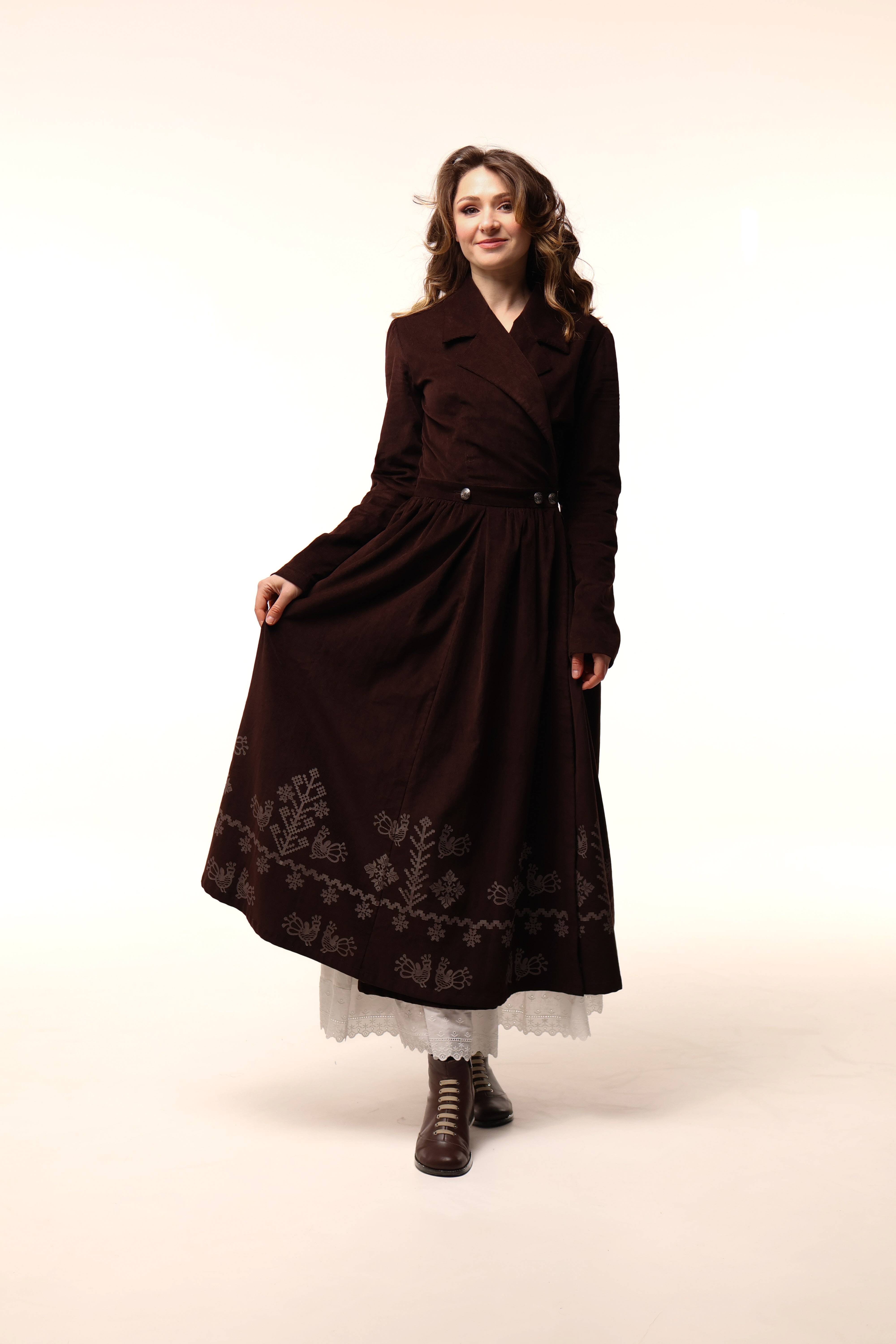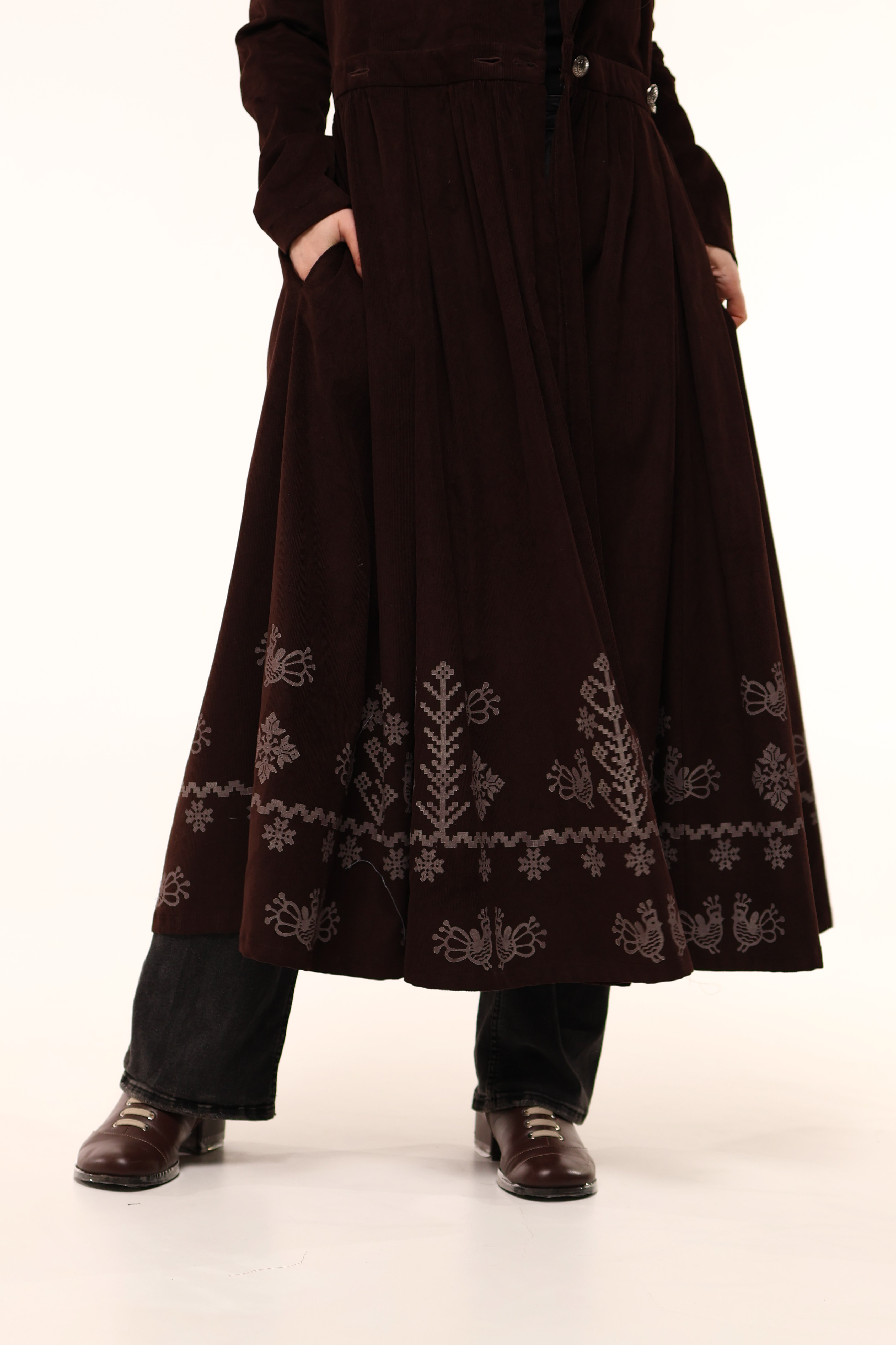 Сукня має бокові кишені та прикрашена вибійкою.